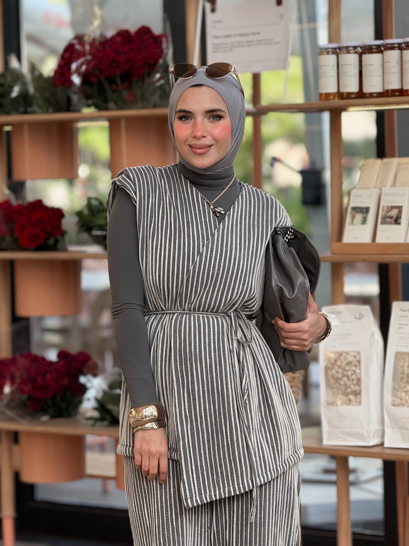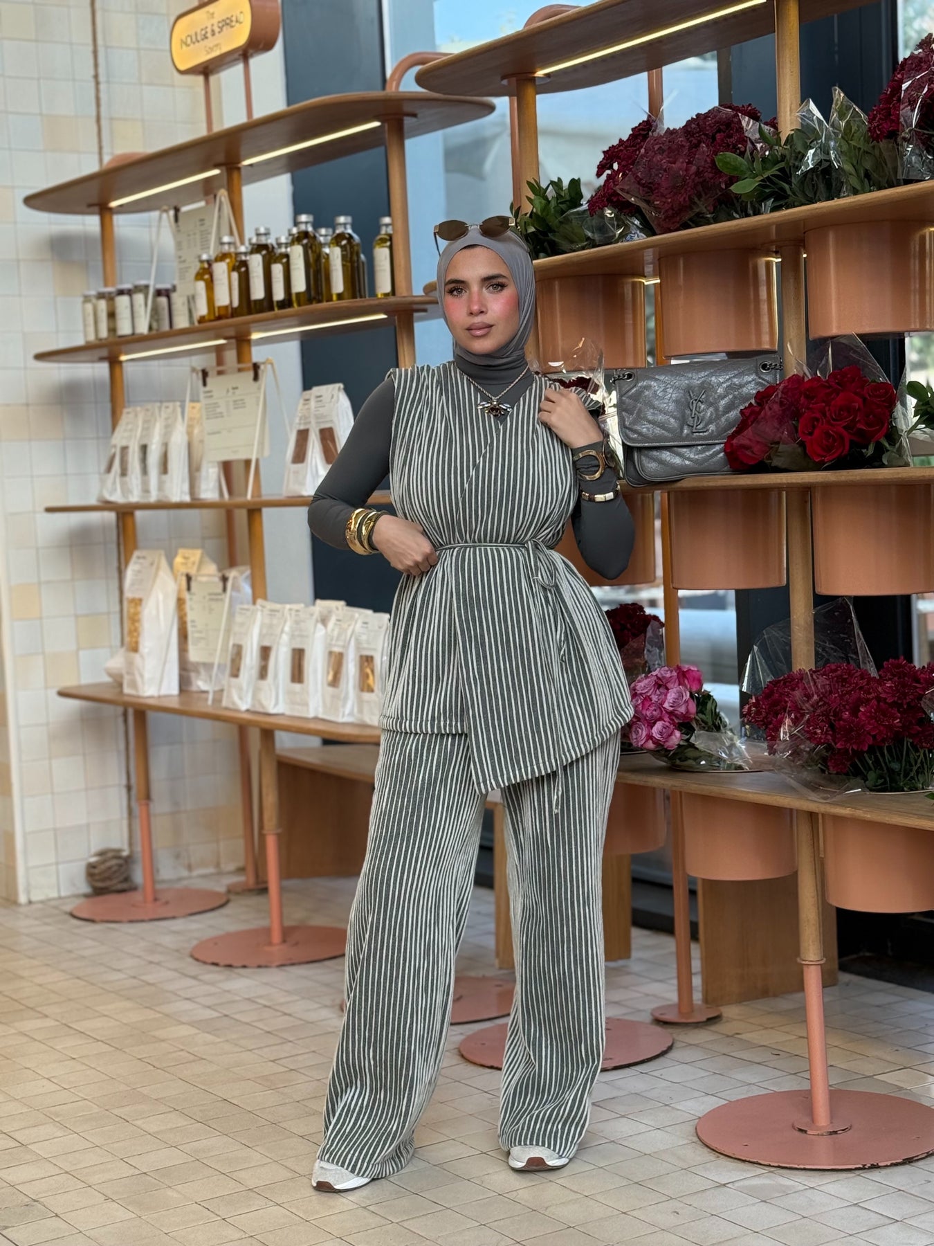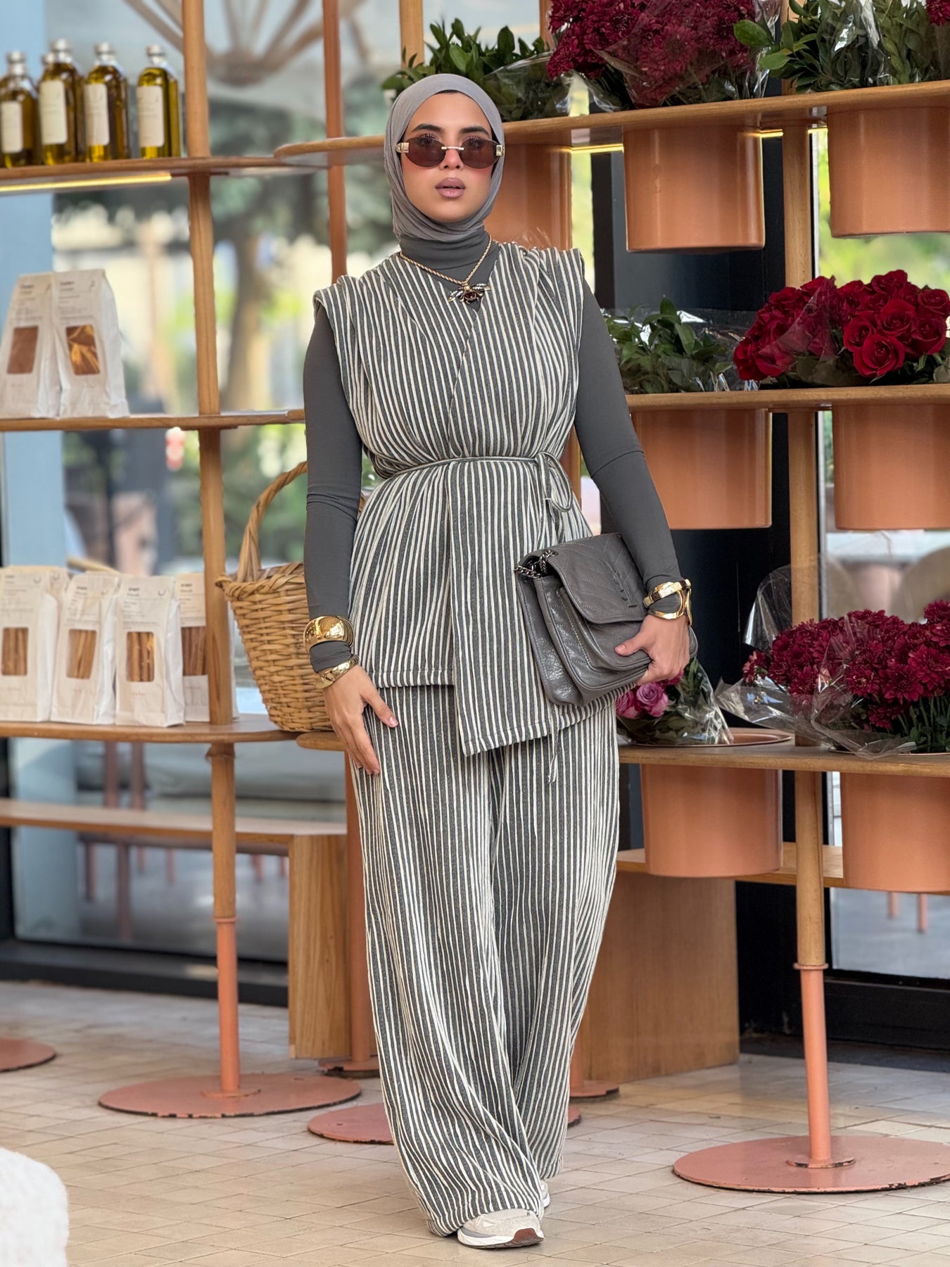 Wide-leg comfort, tailored lines, and an asymmetric hem — a versatile piece made to ease you into fall.