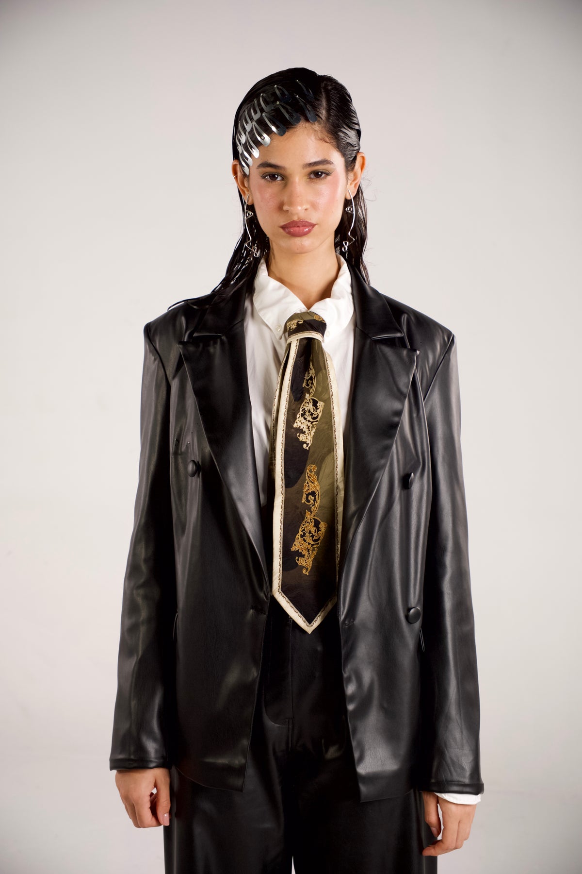 Sleek double-breasted leather blazer with a clean, structured silhouette.